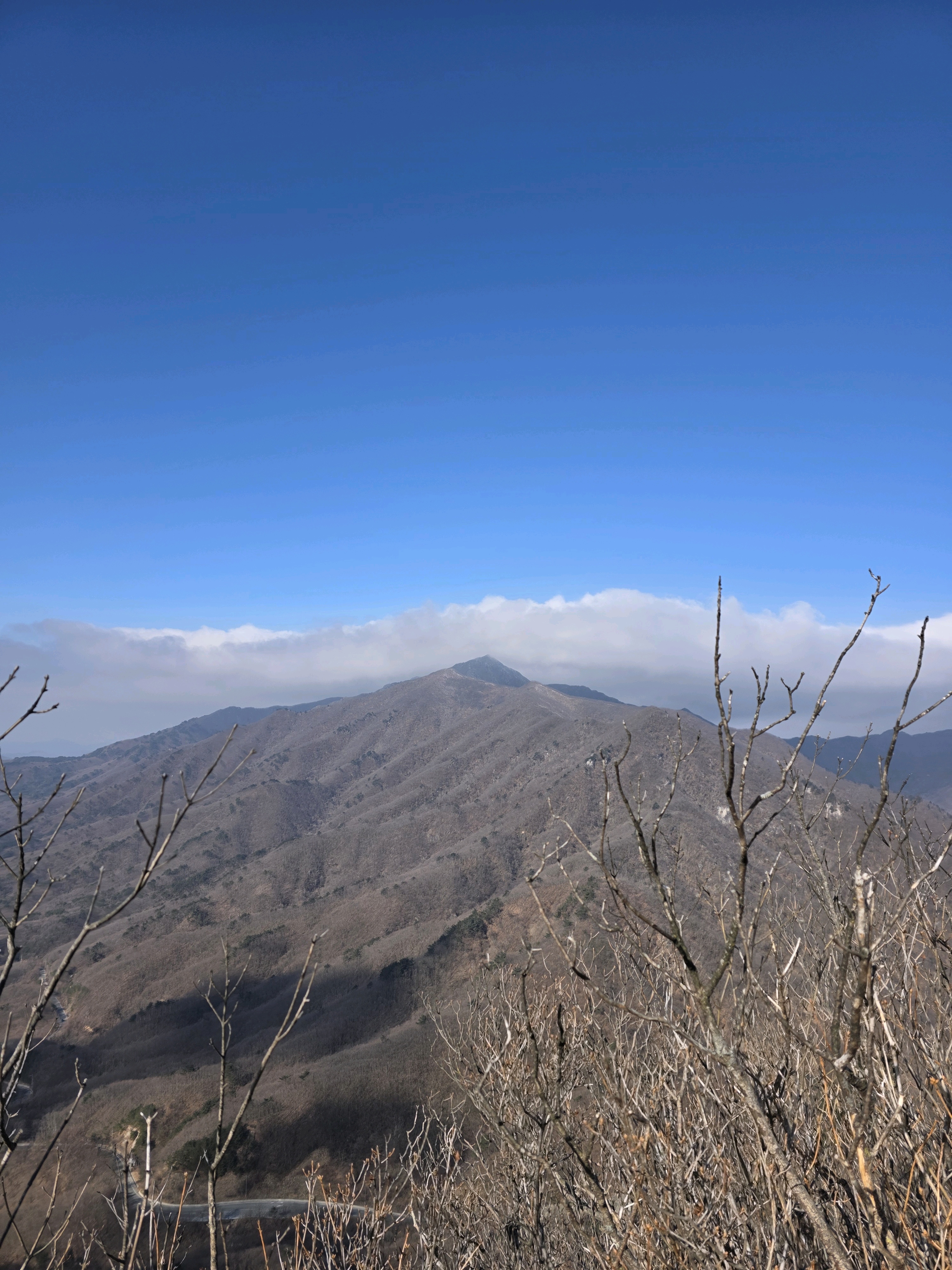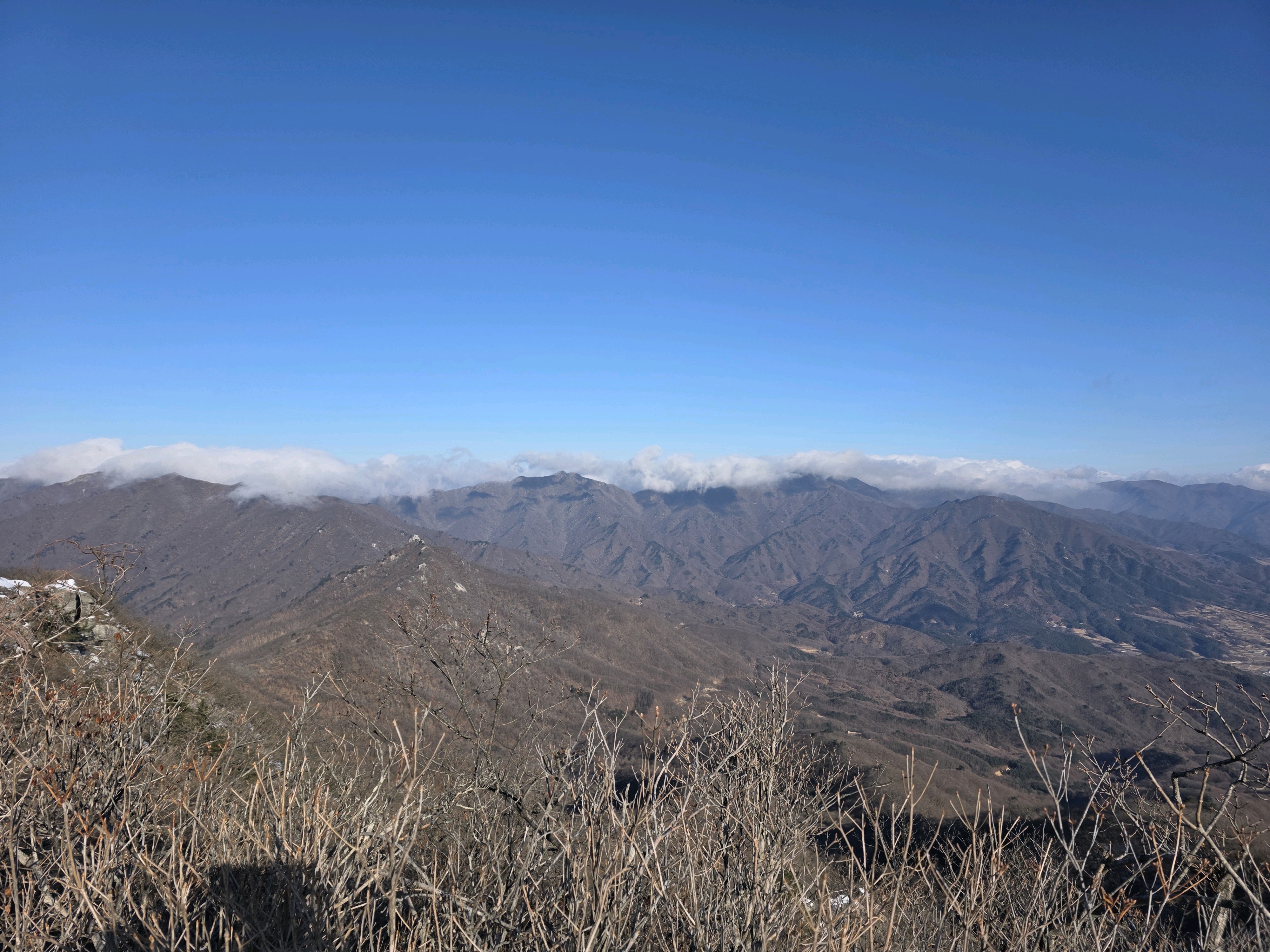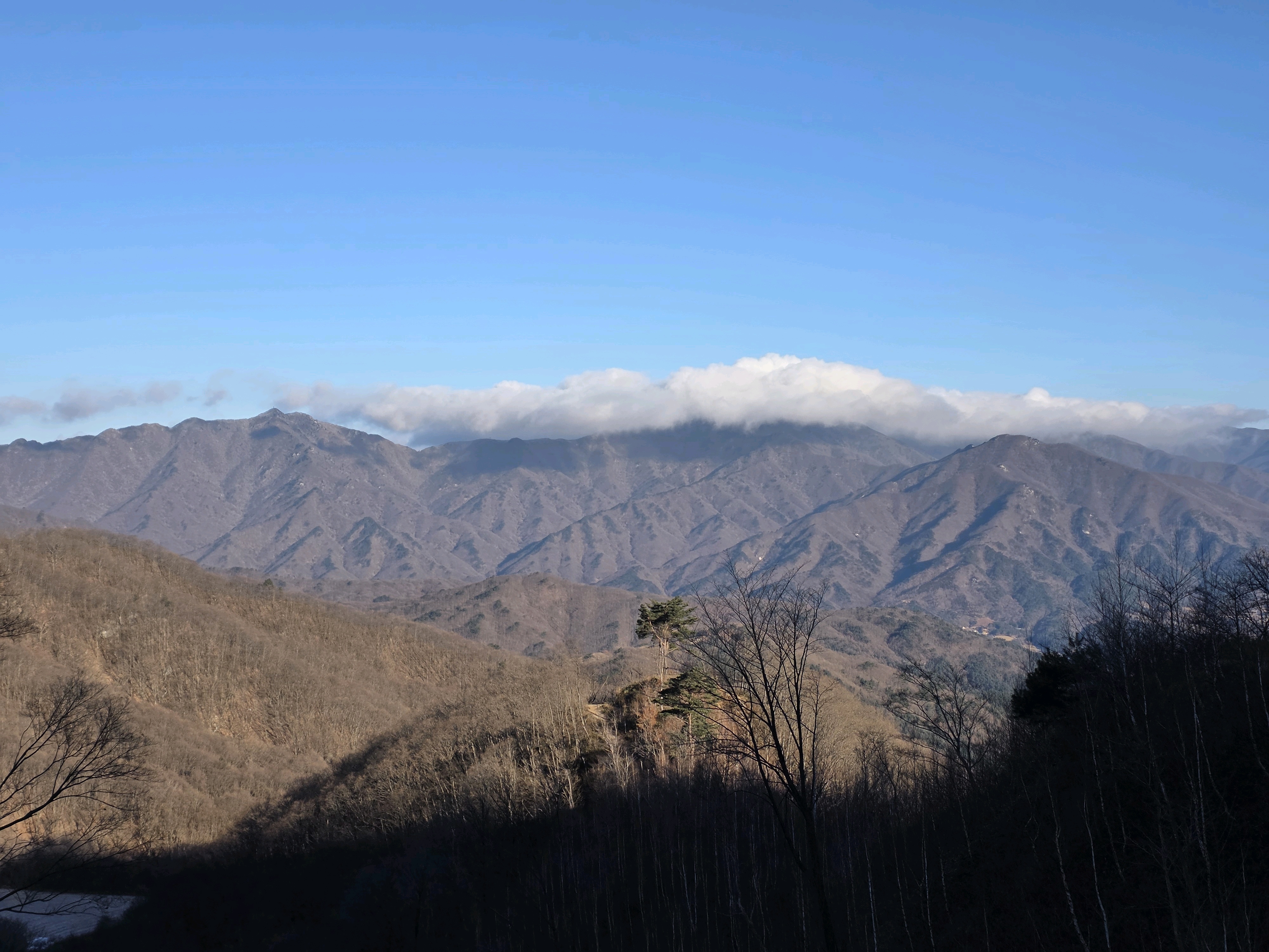 수망령→ 월봉산 등산로, 덕유산 남덕유와 무룡산은 구름을 머리에 이고 있습니다.
