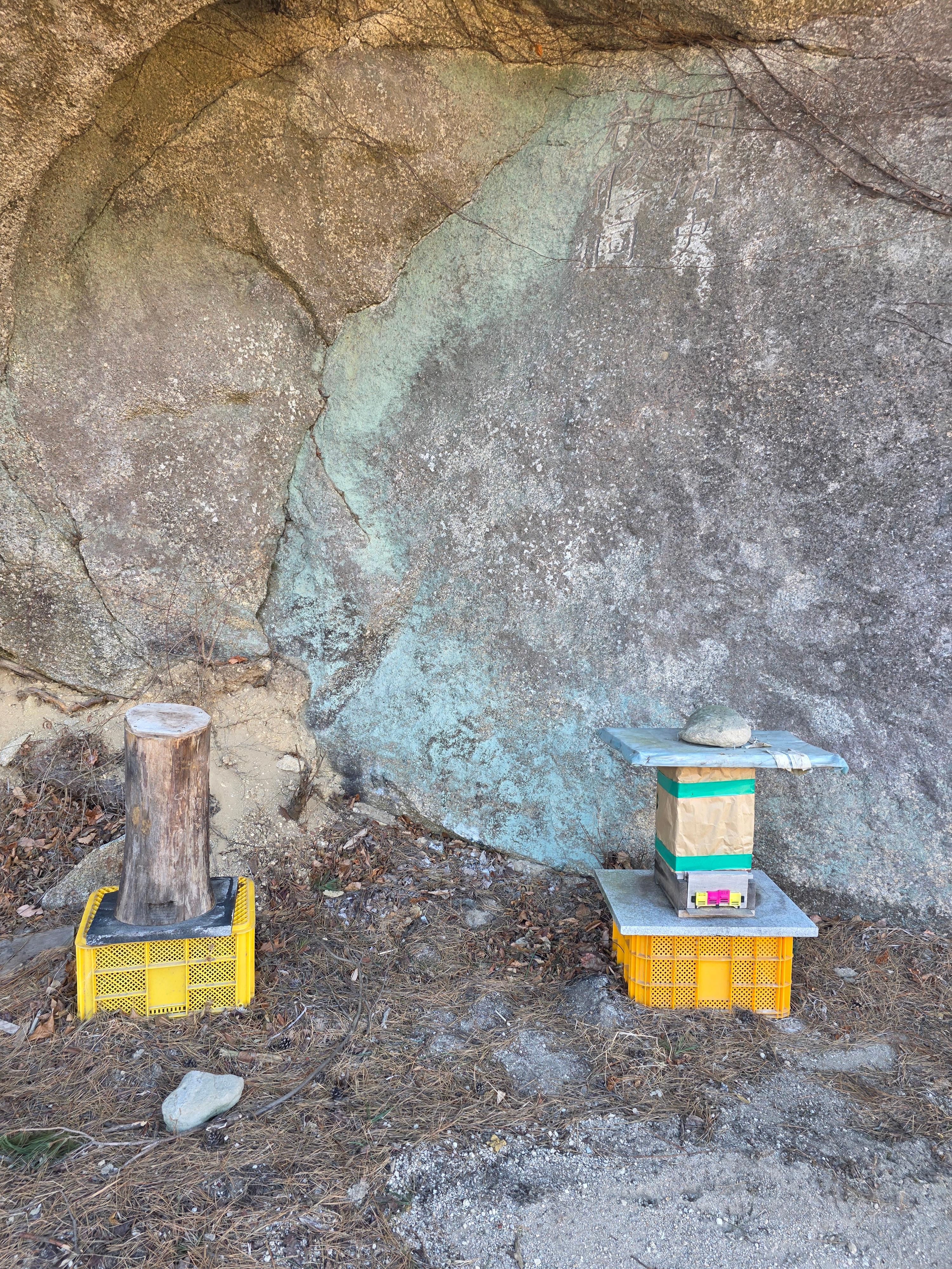 남령→ 월성마을(서출동류물길) 등산로, 바위아래 토종벌통이 있습니다.